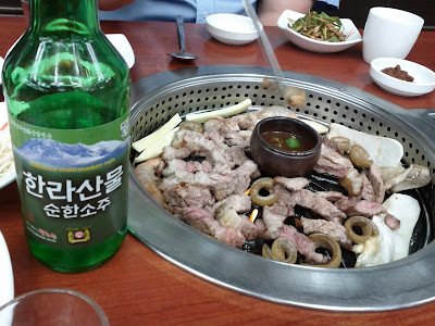 제주대에 있는 조정원 교수의 초청으로 제주도에 왔다. 무선센서네트웍에 관한 특강을 하고, 저녁으로 한라산물이라는 소주와 함께 제주 흑돼지를 먹었다. 주말부터 살짝 감기 몸살 기운있었는데, 오늘은 몸이 더 안좋아졌다. 술을 마실만한 몸 상태가 아니라서 몇 잔 밖에 마시지 못했지만, 술 맛은 좋았고, 고기맛은 더 좋았다. 돼지 껍데기도 고기와 함께 나왔다. 아주 예전에 한번 껍데기 고기를 먹어봤는데, 그 때 느낌은 고무 장판 잘라 놓은 것 같았는데, 이번 것은 그것과 비교가 되지 않게 맛있다.